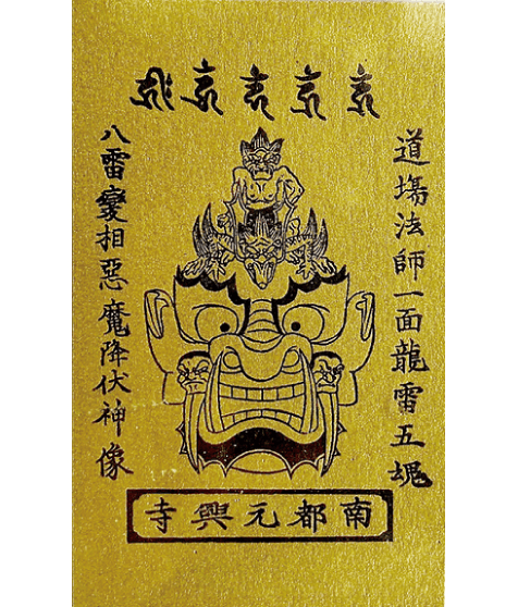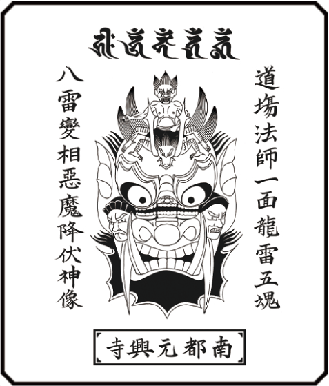 八雷神面の実物を元に新たに意匠を造形し直した令和版の護符です。目線より高い位置に置いてお祀りください。