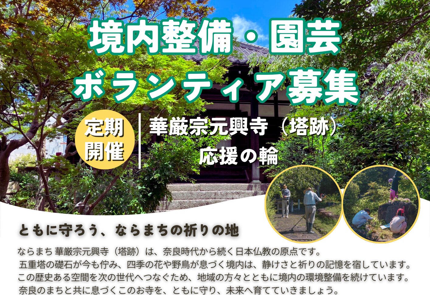 奈良のまちと共に息づくこのお寺を、ともに守り、未来へ育てていきましょう。
