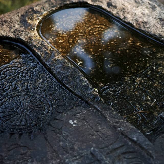 昭和初期の「元興寺大鏡」刊行を記念して奉納された。薬師寺仏足石に範をとった双式仏足石。