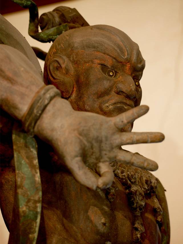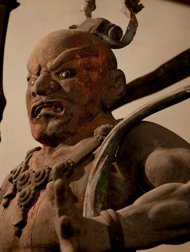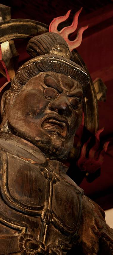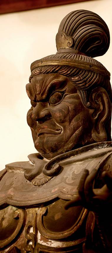 増長天・広目天は大仏殿様の鎌倉時代の作。四天王は幕末の火災で救い出されたものの、持国天・多聞天の破損が著しく、この二天は昭和九年奈良町仏師石原父子により新たに制作されました。