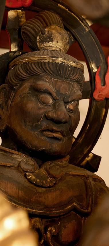 国宝 薬師如来立像は一木造の仏像で、詳しい縁起は伝わっていません。かつては大塔に安置されており、塔が炎上した際、近隣の璉珹寺の僧侶によって担ぎ出されたと伝えられます。その折、僧が心中で「お助かりになりたいのなら、どうか私の肩につかまってください」と祈ると、不思議にも容易に運び出すことができたという逸話が残されています。