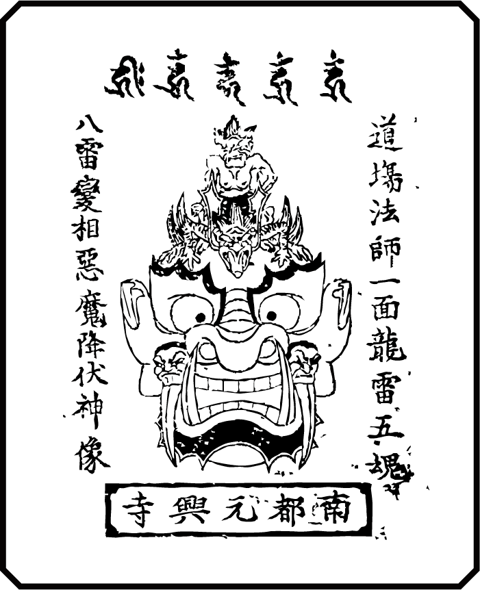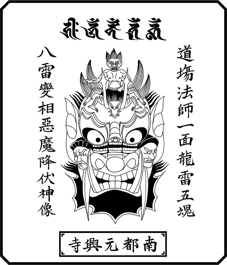 9世紀の仏教説話『日本霊異記』には、雷の申し子である道場法師が元興寺で鬼を退治する話が登場します。その際の形相が八雷神とされ、信仰の対象となりました。 江戸時代には、観音堂などの修復のためにしばしば開帳され、その霊験を広めるために『八雷神面略縁起』が作られました。