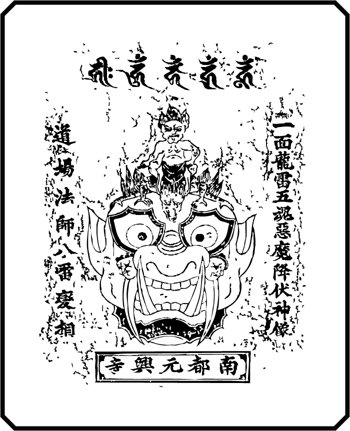 本寺院には、江戸時代に用いられた八雷神面護符の版木が大小2枚現存しており、明治・大正期の荒廃から復興を進めた水野圭真和尚も、この版木を用いて護符授与を復活させたと伝わっています。