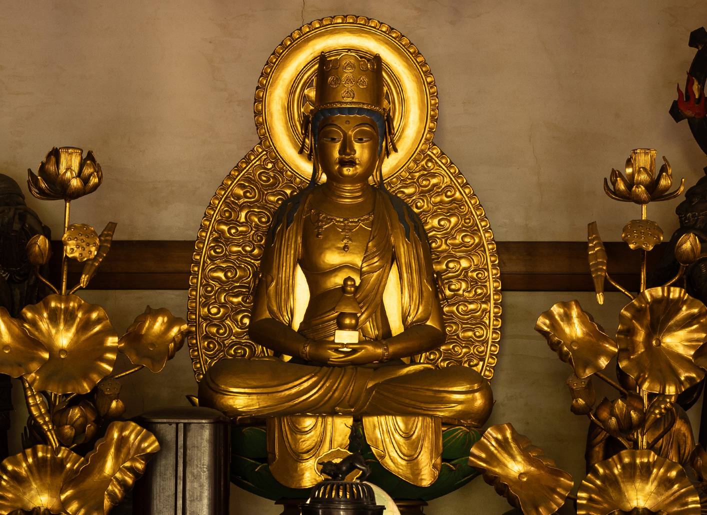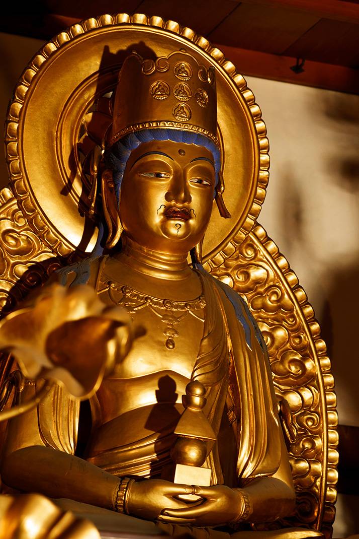 五智宝冠(釈迦、阿閦、阿弥陀、大日、宝生の各如来の化身仏が施された冠)を戴き、白毫(眉間にある巻毛)、三道相(悟りに至る三段階をあらわす首前面の3本のしわ)も施されています。